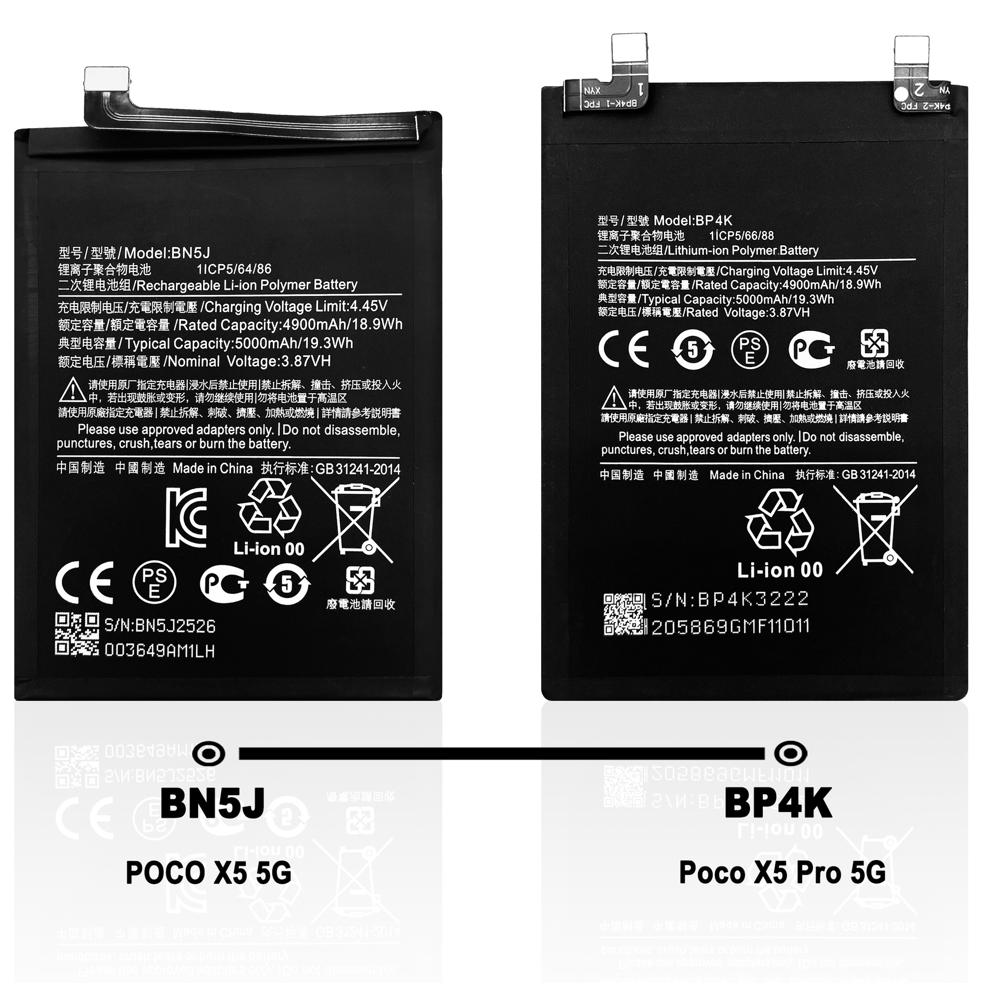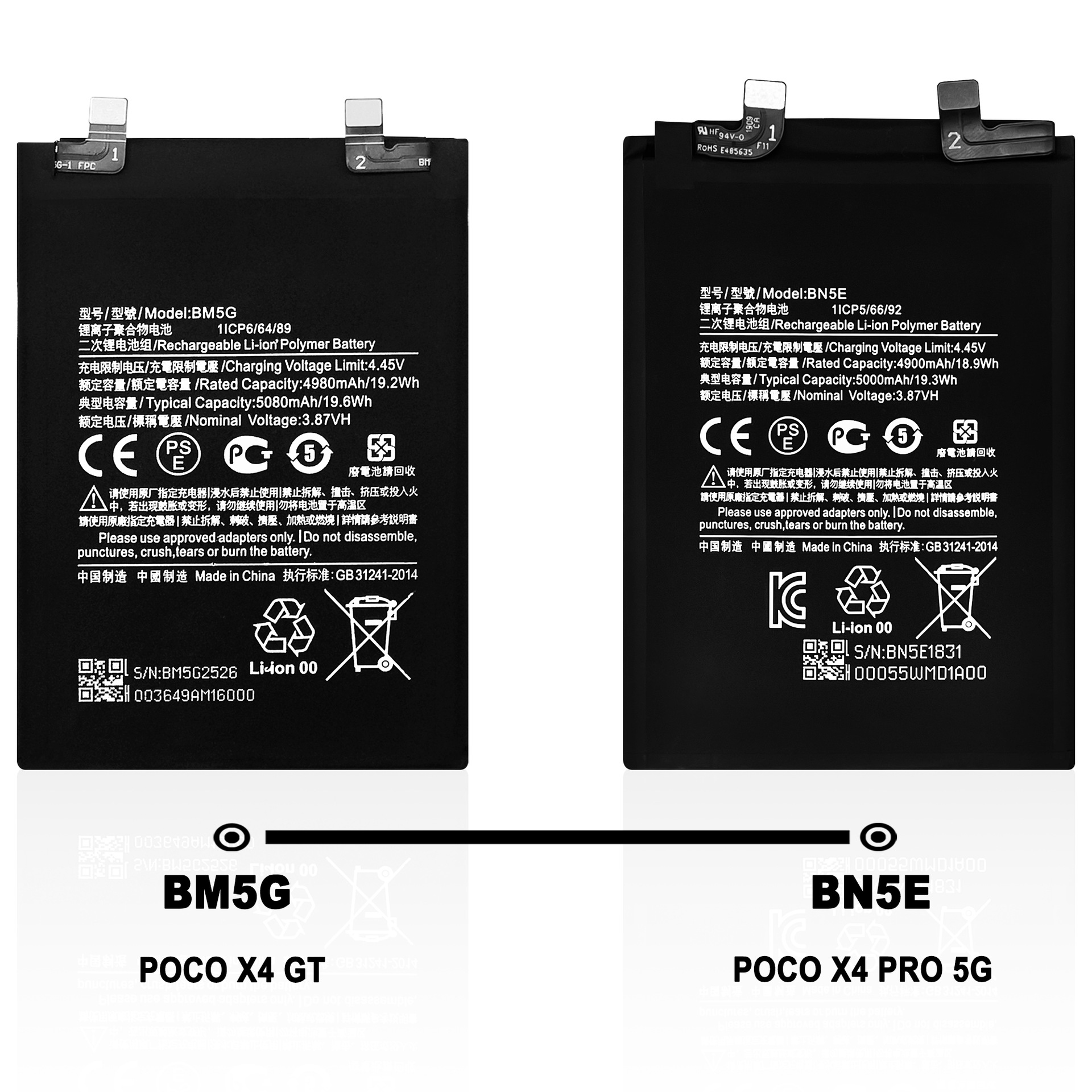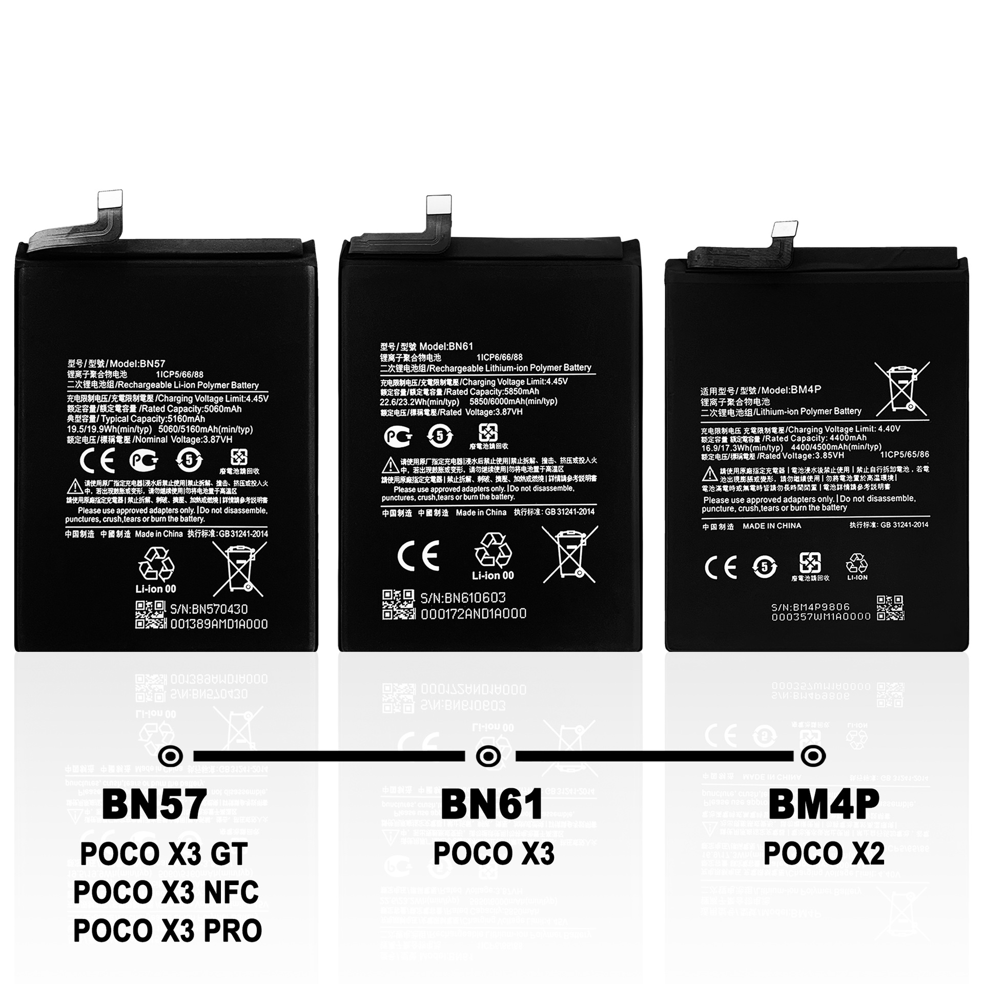 Standard Capacity: POCO X2/BM4P, POCO X3/BN61, Poco X3 GT/BM57, POCO X3 NFC/BN57, POCO X4 GT/BM5G, POCO X4 PRO 5G/BN5E, POCO X5 5G/BN5J, Poco X5 Pro 5G/BP4K